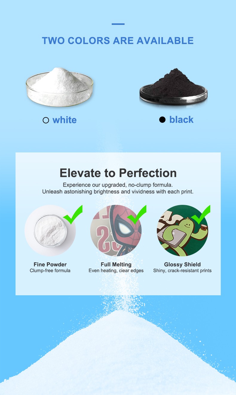 Color choice: White vs. black powder. White hot-melt powder is the standard choice for most applications. However, in 2025, black powder is gaining significant traction. Black powder features a specialized anti-sublimation function — it forms a dark barrier layer during heat pressing that prevents dye migration from dark fabrics into light-colored prints. This is critical for printing bright designs on dark polyester garments.